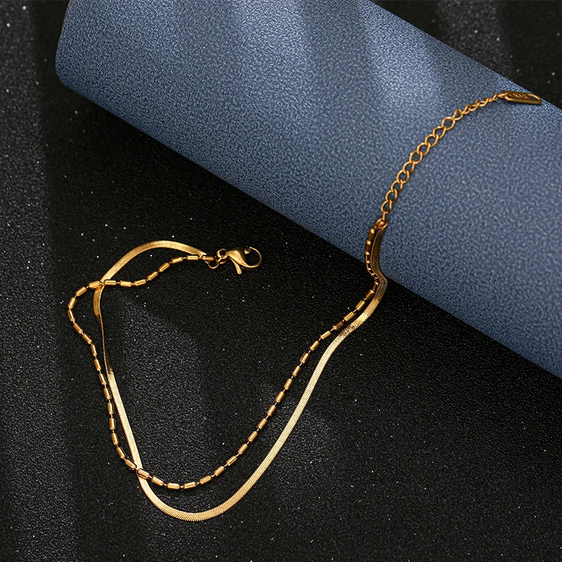 Dodaj zmysłowego blasku swoim letnim stylizacjom i pięknie podkreśl opaleniznę! Ta zjawiskowa, złota bransoletka na kostkę to absolutny "must-have" na nadchodzący sezon. Wyróżnia się niezwykle modną, podwójną konstrukcją, która tworzy bogaty efekt warstwowy (layering). Zbudowana jest z dwóch połączonych łańcuszków: klasycznej, gładkiej płaskiej żmijki, która wspaniale odbija promienie słoneczne, oraz drugiego łańcuszka ozdobionego drobnymi, podłużnymi koralikami. Takie zestawienie prezentuje się na nodze bardzo nowocześnie i ekskluzywnie.