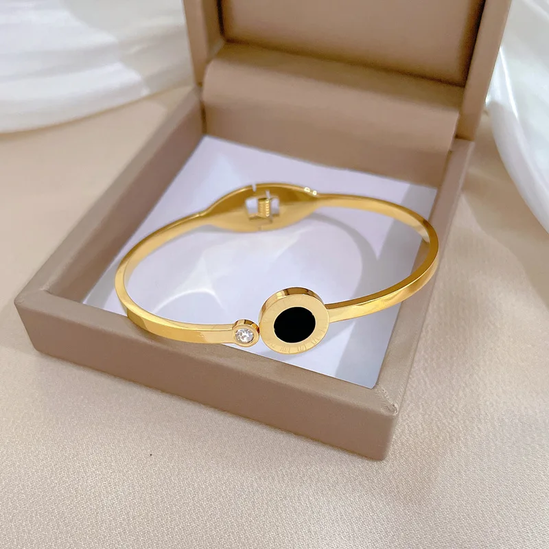 Zdefiniuj swój styl na nowo. Ta niezwykle elegancka, sztywna bransoletka (typu bangle) ze stali chirurgicznej to dodatek, który natychmiast przyciąga spojrzenia. Jej główną ozdobę stanowi wyraziste, czarne kółko otoczone subtelnie wygrawerowanymi cyframi rzymskimi, co nawiązuje do najbardziej pożądanych, luksusowych trendów jubilerskich. Kompozycję idealnie dopełnia pojedyncza, lśniąca cyrkonia, która dodaje całości delikatnego, kobiecego blasku.