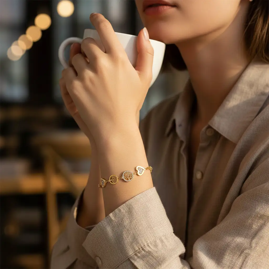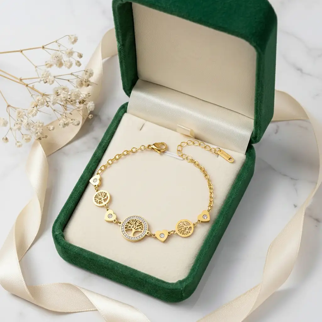 Odkryj biżuterię, która kryje w sobie piękną historię. Ta wyjątkowa, złota bransoletka ze stali chirurgicznej to połączenie głębokiej symboliki z niesamowitą elegancją. Centralnym punktem kompozycji jest okrągła zawieszka z precyzyjnie wyciętym motywem Drzewa Życia (Drzewka Szczęścia), otoczonym lśniącą aureolą z drobnych cyrkonii. Po bokach umieszczono mniejsze drzewka oraz urocze serduszka, w których również osadzono pojedyncze, błyszczące kamienie. To prawdziwy talizman siły, rodziny i miłości, który pięknie układa się na nadgarstku.