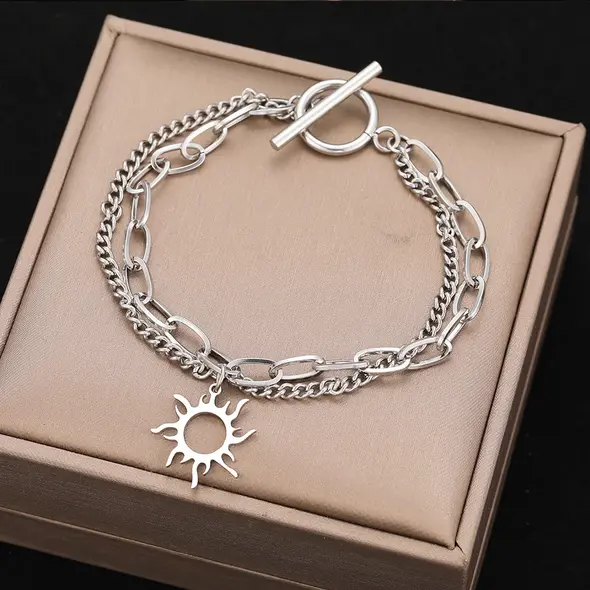 Poczuj letnią energię każdego dnia! Ta zjawiskowa, podwójna bransoletka ze stali chirurgicznej z motywem słońca to kwintesencja swobody, witalności i najgorętszych trendów w stylu boho. Jej unikalny design opiera się na modnym efekcie warstwowym (layering). Na jednym zapięciu połączono dwa zupełnie różne łańcuszki: gęstą, klasyczną pancerkę oraz absolutny hit sezonu – łańcuszek o wydłużonych ogniwach typu spinacz (paperclip). Całość wieńczy wyrazista zawieszka w kształcie słońca z fantazyjnymi promieniami. Model dostępny jest w promiennym złocie oraz eleganckim srebrze.