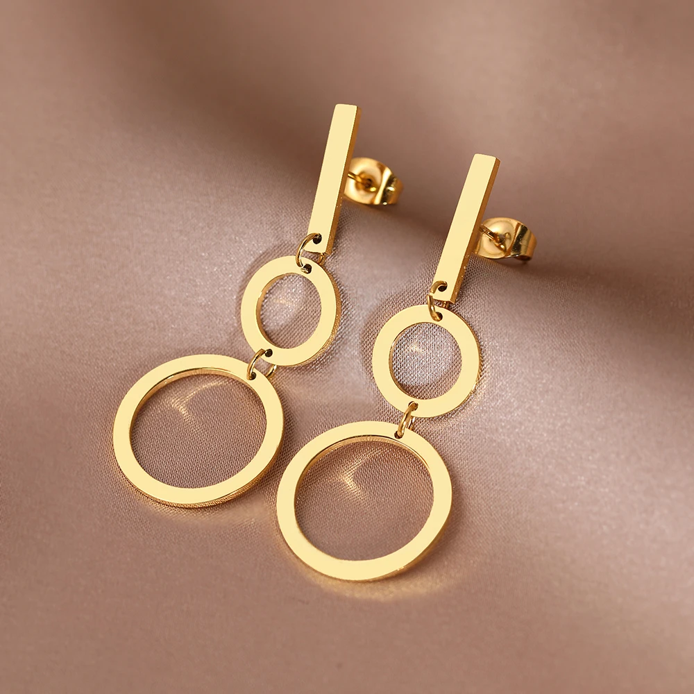 Kolczyki mają optymalną długość około 4,5 cm, dzięki czemu wspaniale wysmuklają rysy twarzy. Zostały wykonane z najwyższej klasy stali szlachetnej 316L pokrytej trwałym złoceniem. Jest to materiał w 100% antyalergiczny (nie uwalnia niklu), całkowicie wodoodporny i odporny na rdzewienie. Z myślą o komforcie i bezpieczeństwie, wyposażono je w solidne zapięcie angielskie, które gwarantuje, że kolczyki nie odepną się przypadkowo podczas zabawy czy tańca.