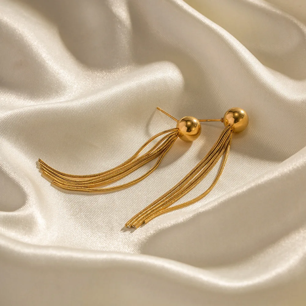 Efektowny dodatek, który przyciąga spojrzenia. Te zjawiskowe długie kolczyki wiszące to kwintesencja stylu glamour. Ich górną część stanowi lśniąca, gładka złota kula, która elegancko zdobi płatek ucha. Spod niej kaskadowo opadają liczne, delikatne łańcuszki o splocie żmijki (snake), tworząc efekt "chwosta". Taka konstrukcja sprawia, że kolczyki pięknie "płyną" przy każdym ruchu głowy, mieniąc się w świetle.