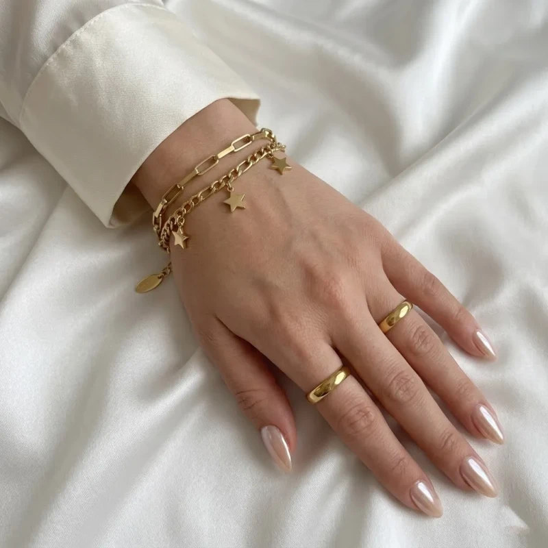 Bransoletka została wykonana w całości z najwyższej jakości stali chirurgicznej 316L pokrytej trwałym, luksusowym złoceniem. To materiał stworzony do intensywnego, codziennego noszenia. Jest w 100% antyalergiczny (całkowicie pozbawiony niklu) i bezpieczny dla wrażliwej skóry. Co więcej, stal szlachetna gwarantuje wyjątkową trwałość – biżuteria jest wodoodporna, nie czernieje i nie wyciera się. Możesz cieszyć się jej perfekcyjnym, złotym blaskiem przez długie lata, bez konieczności ciągłego ściągania jej z nadgarstka.