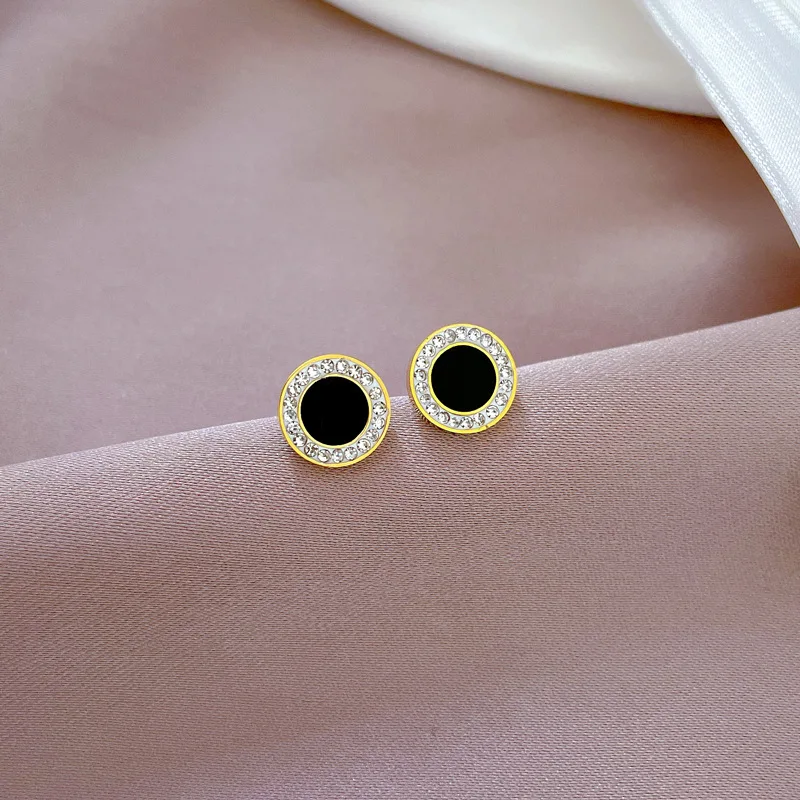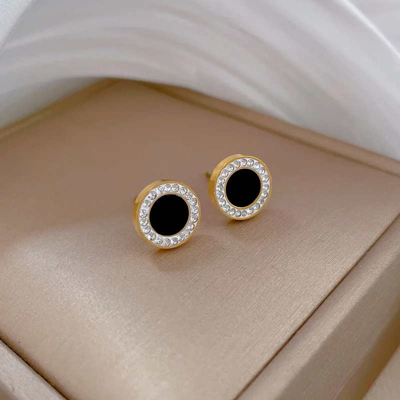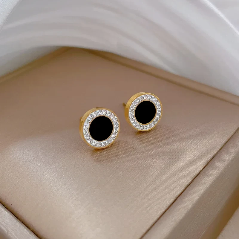 Klasyczna elegancja w stylu glamour. Te wyjątkowe złote kolczyki na sztyfcie to biżuteria, która nigdy nie wyjdzie z mody. Ich centralnym punktem jest gładkie, lśniące kółko w kolorze głębokiej czerni (trwała emalia/akryl), które zostało otoczone wianuszkiem drobnych, iskrzących się cyrkonii. Ten kontrast czerni, złota i bieli kamieni nadaje całości luksusowego charakteru.