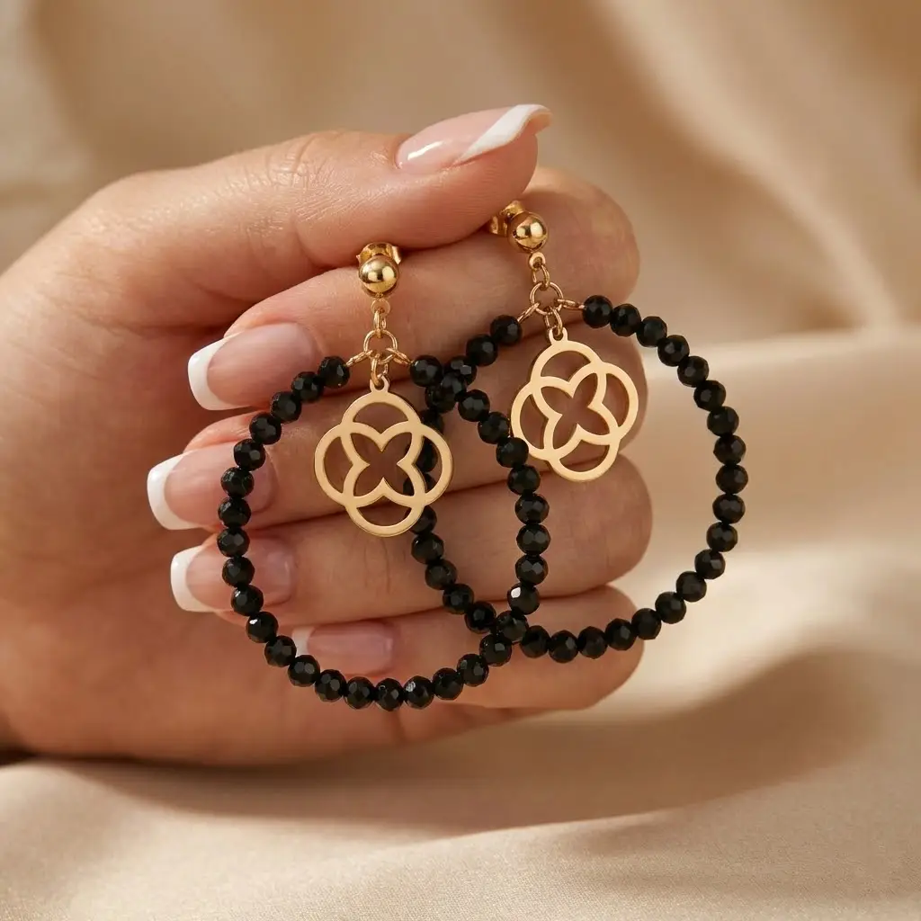 Złote Kolczyki Koła z Czarnych Koralików z Koniczynką – Stal Chirurgiczna