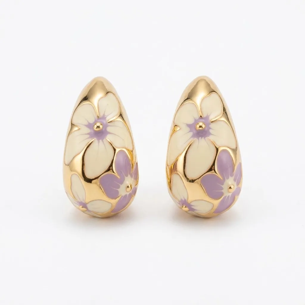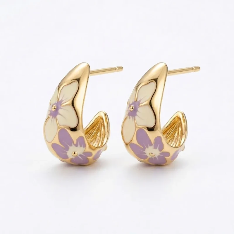 Złote Kolczyki Półkola Emaliowane Kwiaty – Stal Chirurgiczna
