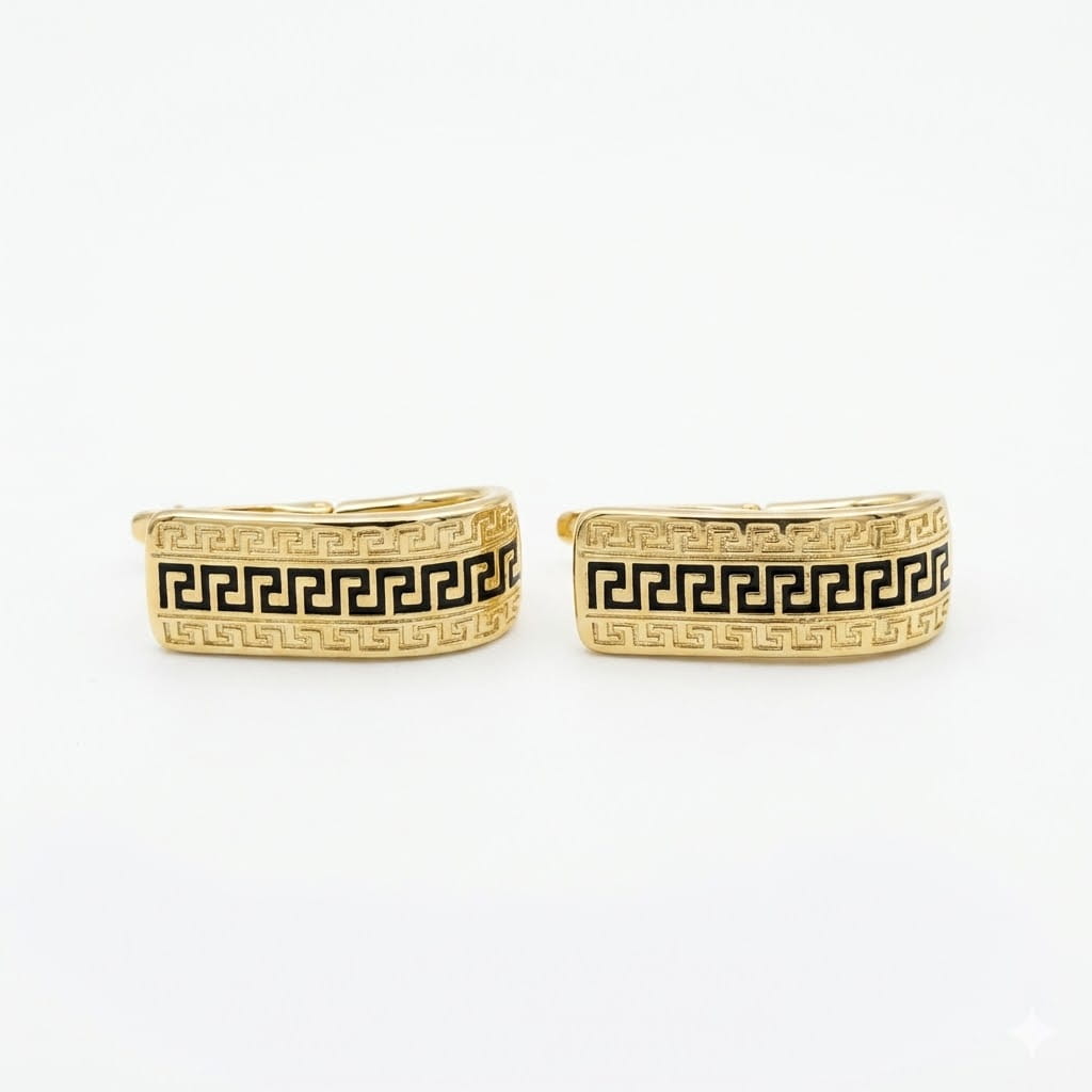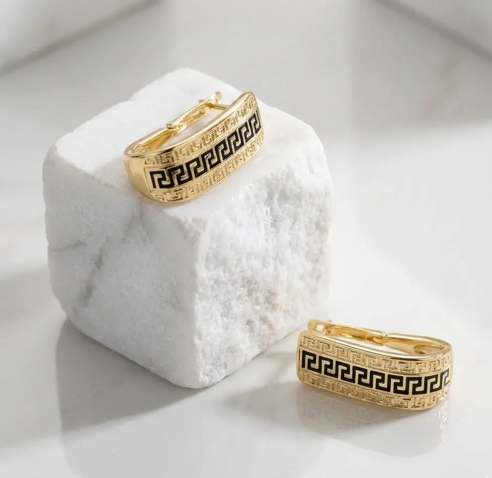 Klasyka, która przyciąga spojrzenia. Te stylowe złote kolczyki o długości 2 cm to doskonały wybór dla kobiet ceniących ponadczasową elegancję z nutą luksusu. Ich prostokątny, lekko zaokrąglony kształt idealnie przylega do płatka ucha. Główną ozdobą jest tu wyraźny, czarny grecki wzór (meander), który pięknie kontrastuje ze złotym wykończeniem i fakturowanym tłem.