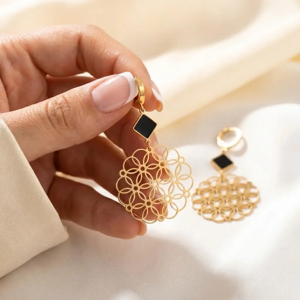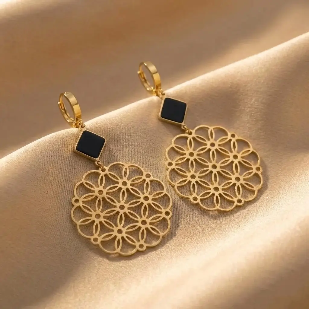 Harmonia kształtów i lekkość formy. Te efektowne długie kolczyki (6 cm) to mistrzowskie połączenie nowoczesnej geometrii ze stylem boho-glam. Górną część stanowi elegancki, czarny element w kształcie rombu, osadzony w złotej ramce, który stanowi idealny kontrast dla dolnej części. Główną ozdobą jest duża, okrągła rozeta o średnicy 3 cm, wycięta w precyzyjny, ażurowy wzór przypominający mandalę lub "Kwiat Życia".