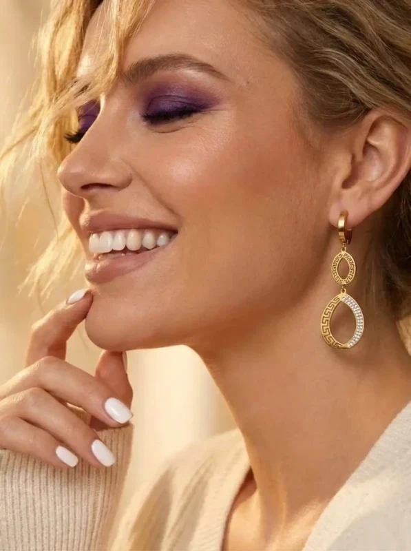 Królewska elegancja, obok której nie sposób przejść obojętnie. Te zjawiskowe, wiszące kolczyki ze stali chirurgicznej to mistrzowskie połączenie klasyki z luksusowym blaskiem. Ich konstrukcja opiera się na dwóch połączonych ze sobą elementach w kształcie łezki (kropli). Krawędzie kolczyków zostały precyzyjnie wycięte w misterny, antyczny wzór grecki (meander), symbolizujący nieskończoność. Aby nadać biżuterii prawdziwie wieczorowego charakteru, wewnętrzna część dolnej, większej łezki została asymetrycznie i gęsto wysadzona lśniącymi cyrkoniami, które wspaniale odbijają światło przy każdym ruchu głowy.