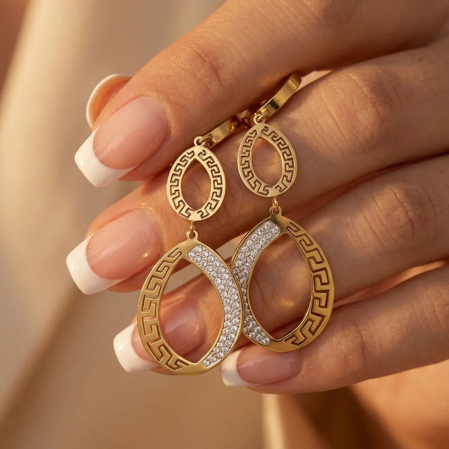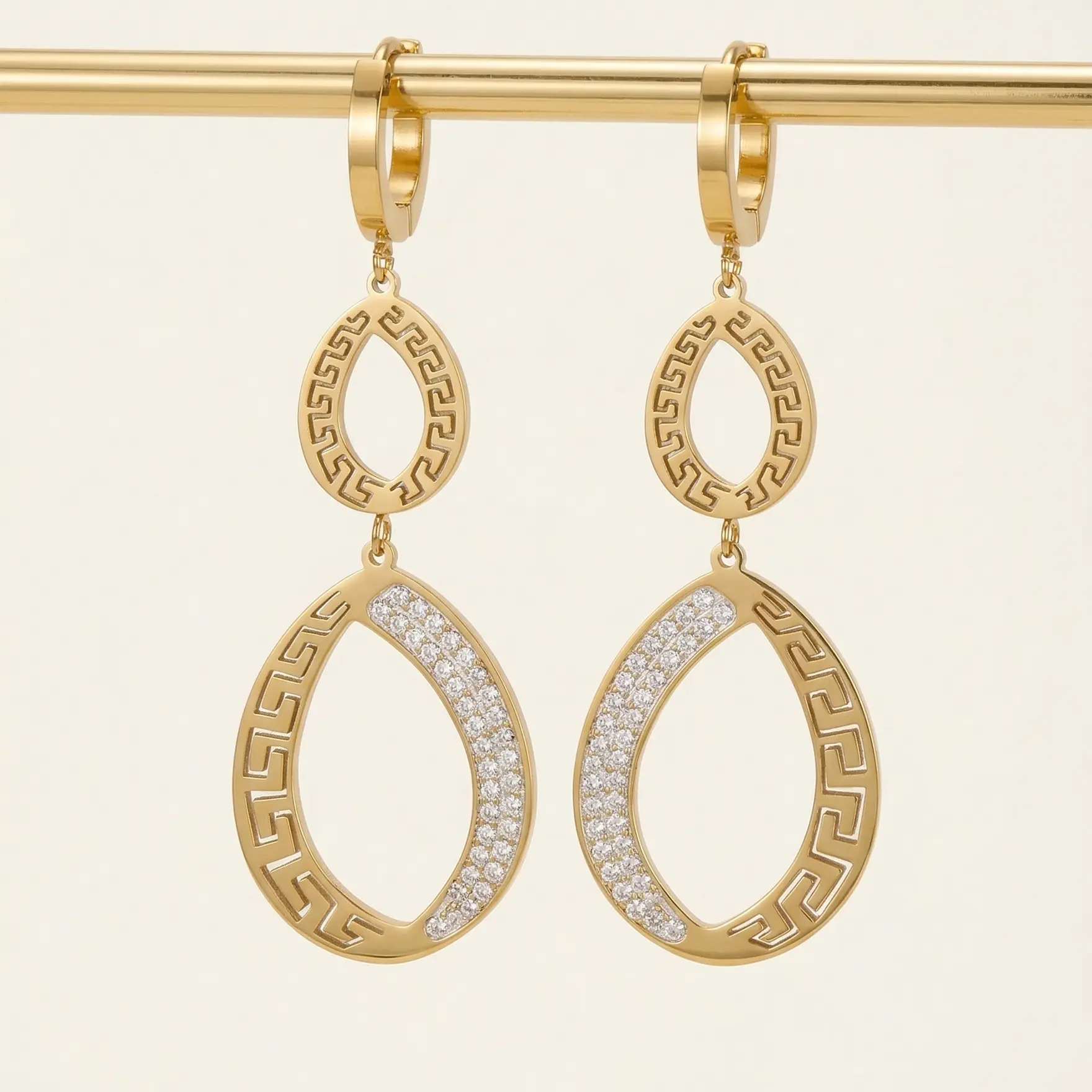 Złote Kolczyki Wiszące Wzór Grecki Cyrkonie – Stal Chirurgiczna
