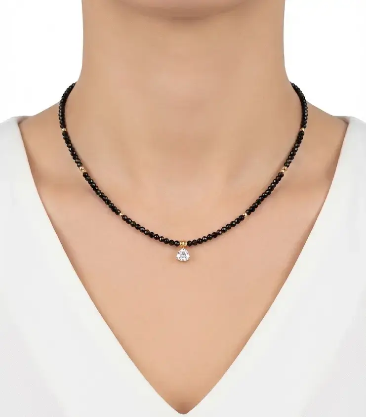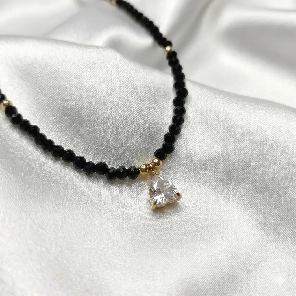 Złoty Naszyjnik Czarne Koraliki z Kryształową Zawieszką – Stal Chirurgiczna