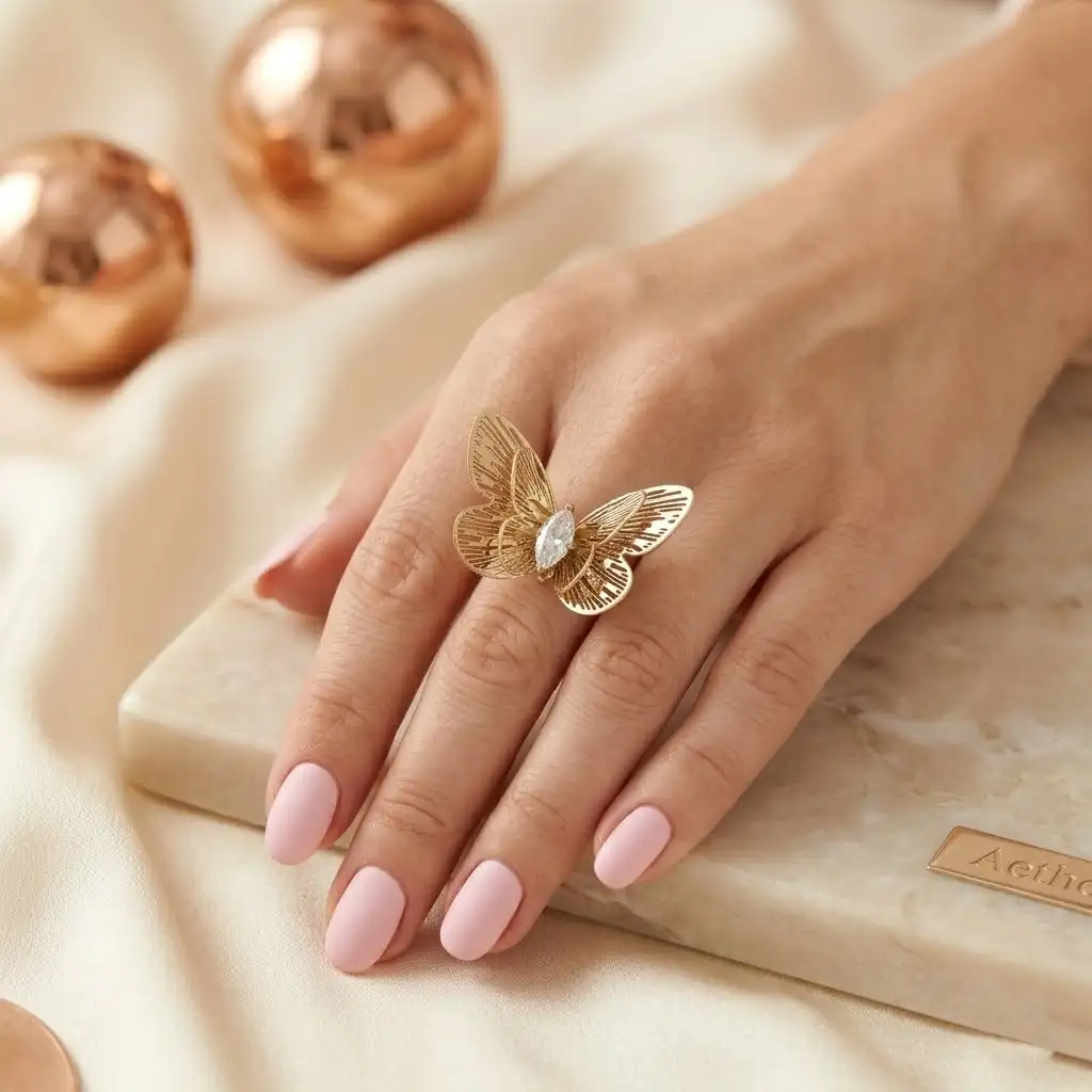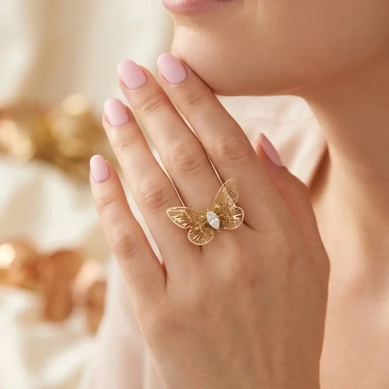 Złoty Pierścionek Duży Ażurowy Motyl Cyrkonia – Stal Chirurgiczna