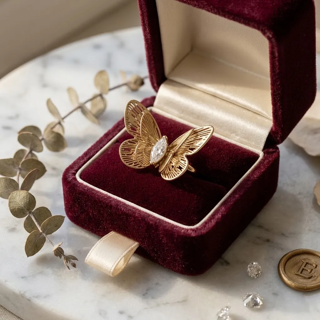 Zaprojektowaliśmy ten model z myślą o komforcie. Krawędzie skrzydeł zostały precyzyjnie wygładzone, a sam motyl delikatnie profilowany do kształtu palca. Niemniej, jak przy każdym tak dużym pierścionku, zalecamy ostrożność przy bardzo delikatnych dzianinach.