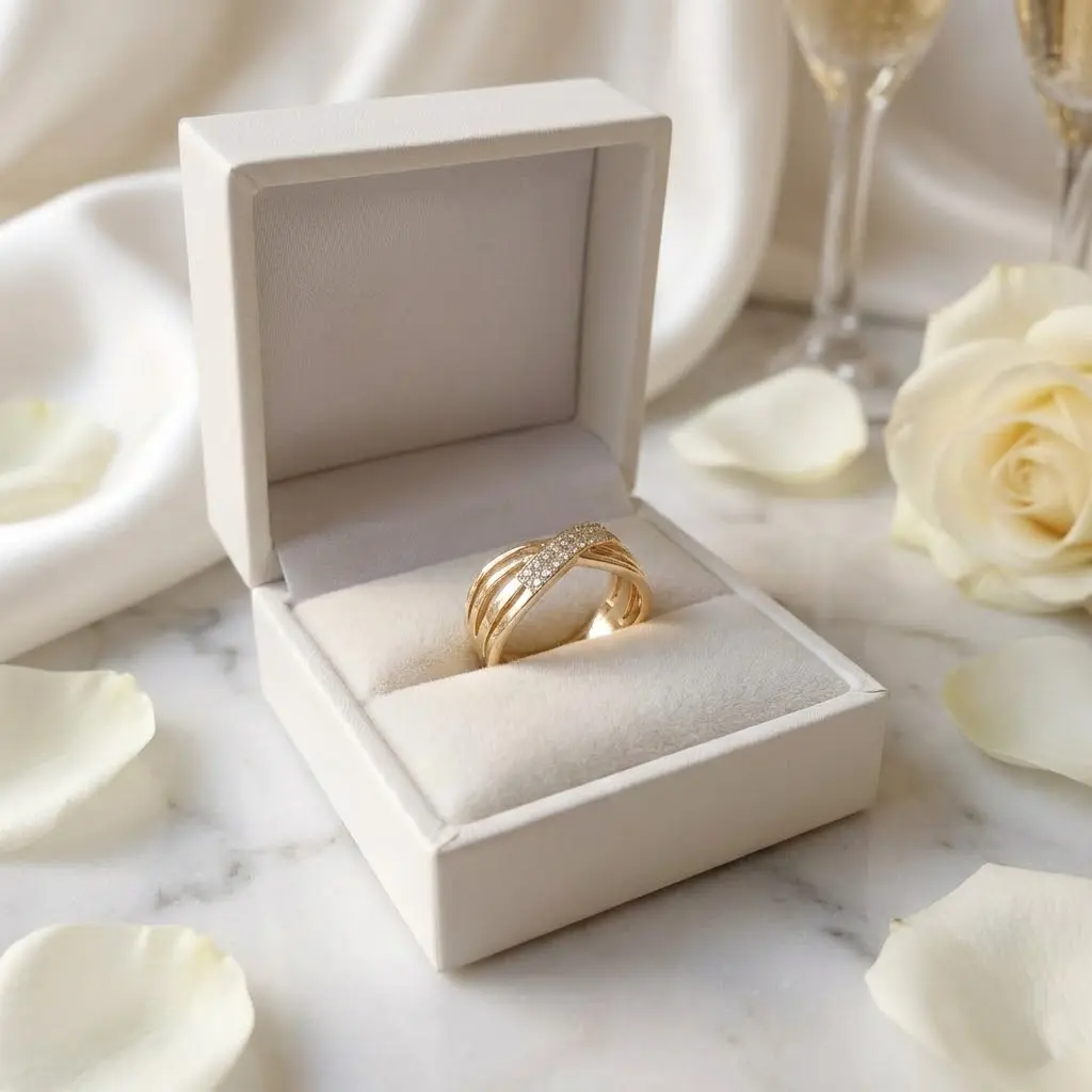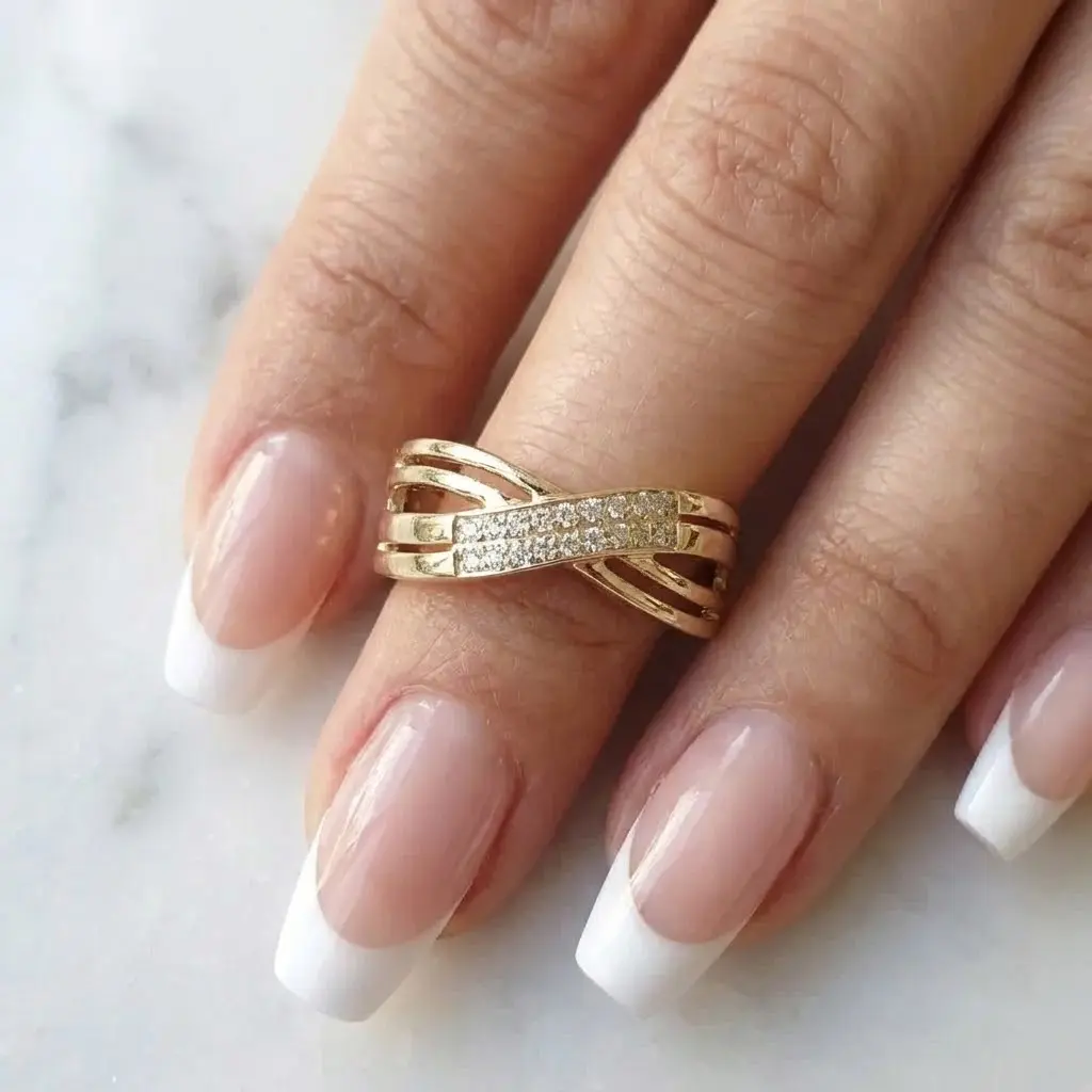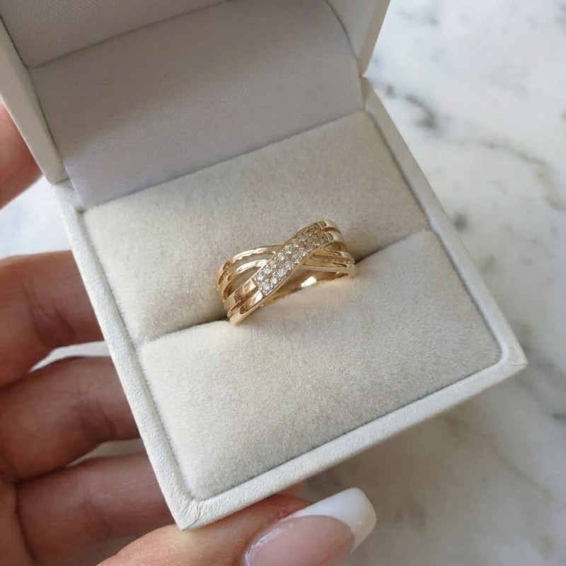 - Efektowny design: Przeplatana forma "X" optycznie wysmukla palec, mimo że pierścionek jest szeroki i widoczny.