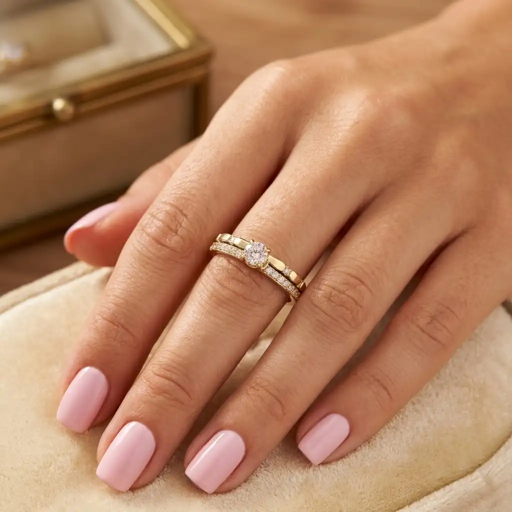 - Efekt "WOW": Konstrukcja przypominająca gładką obrączkę połączoną z pierścionkiem zaręczynowym to jeden z najbardziej pożądanych i najmodniejszych wzorów jubilerskich.
