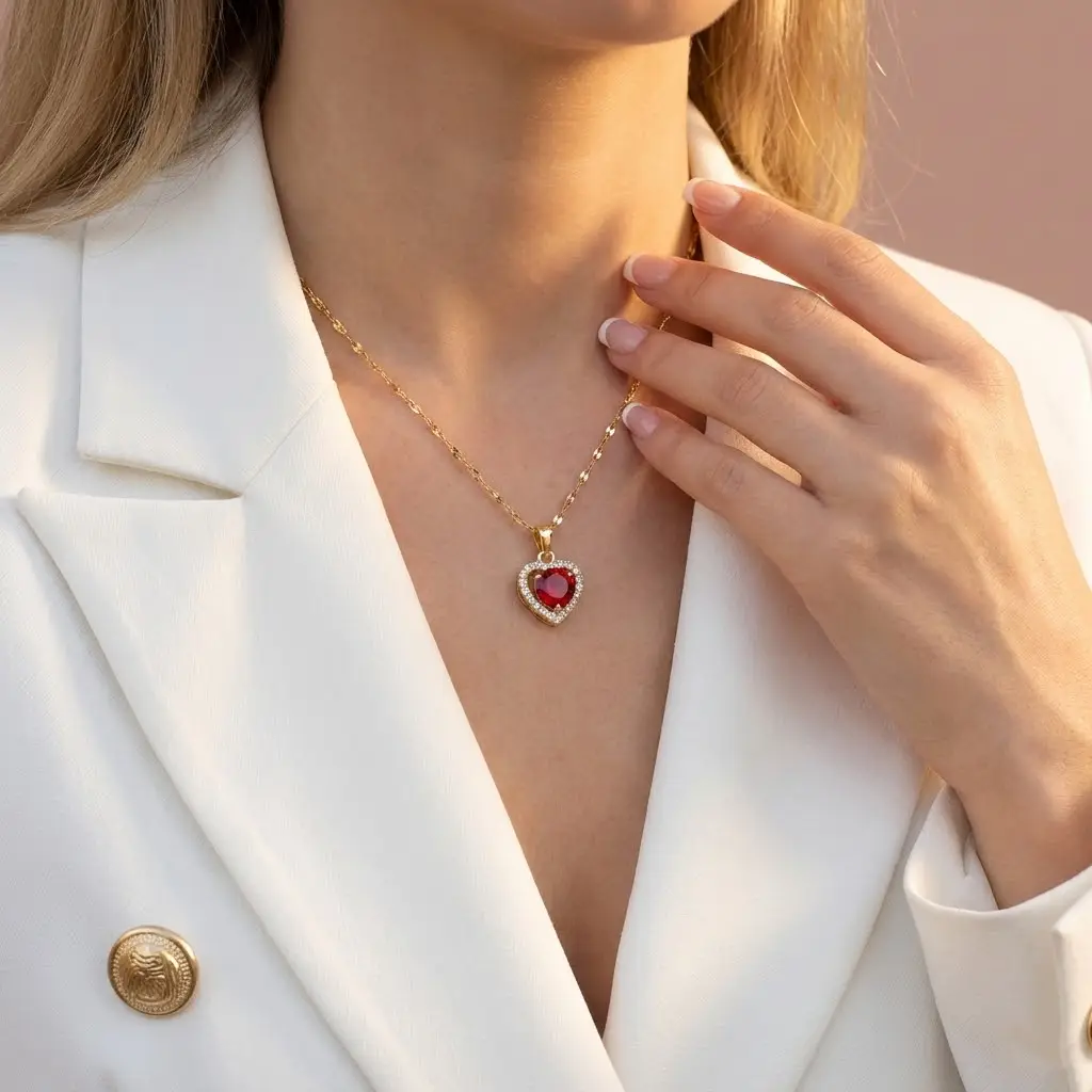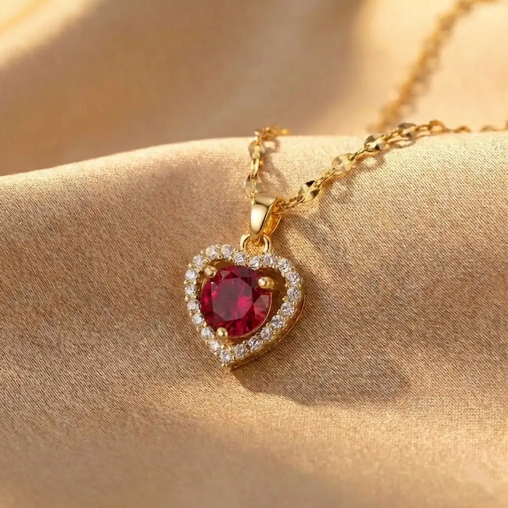 Złoty Naszyjnik Serce z Czerwonym Kryształem Premium – Stal Chirurgiczna