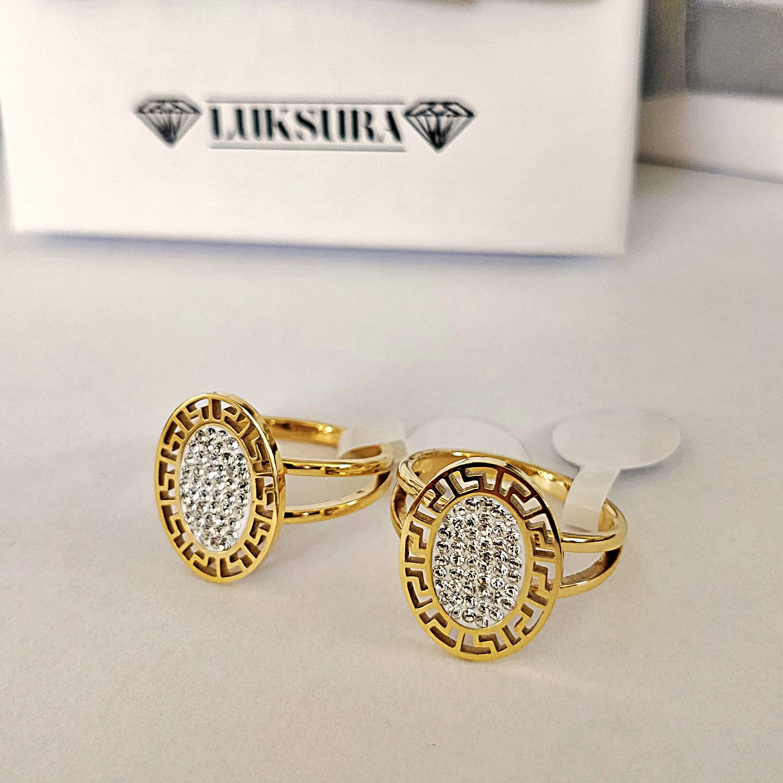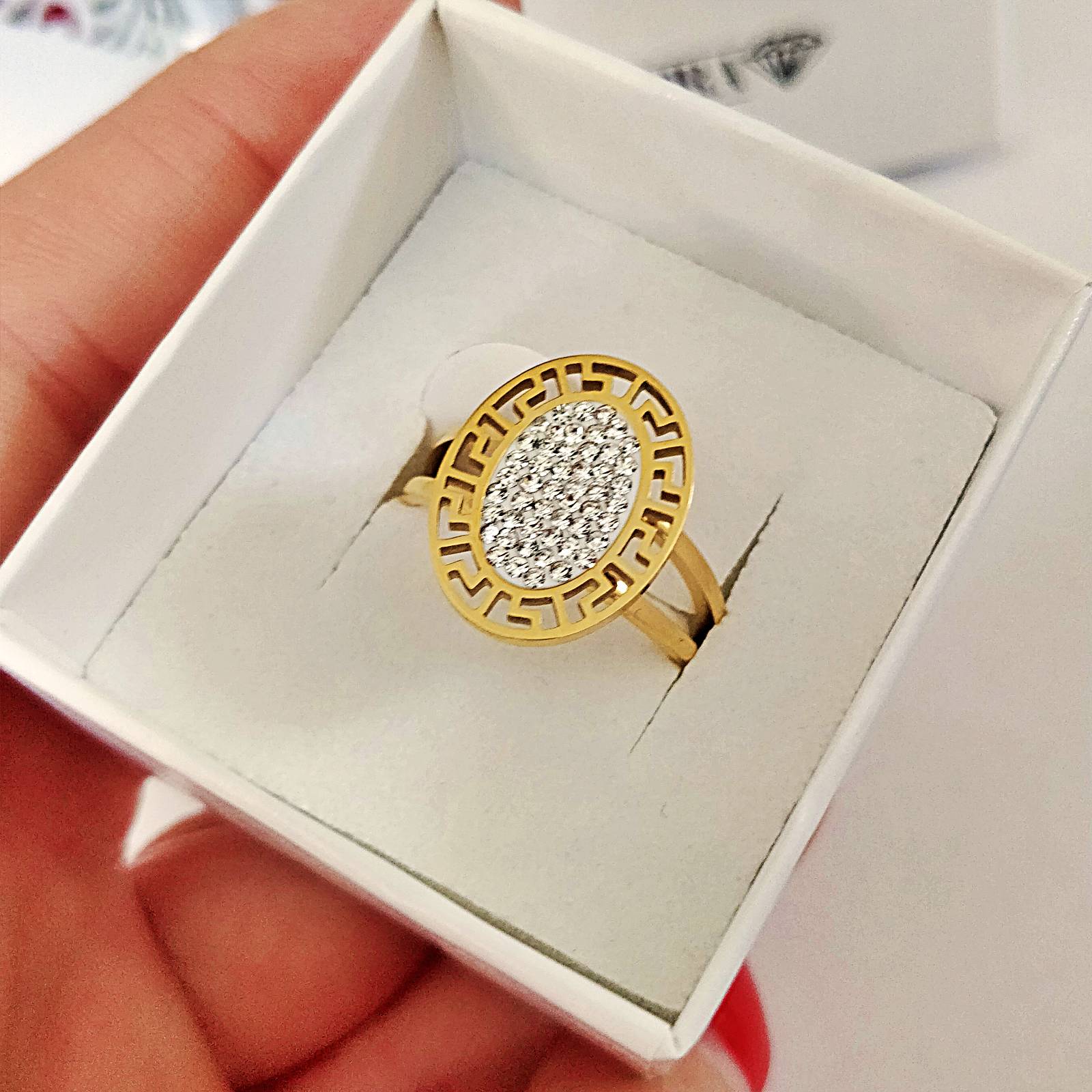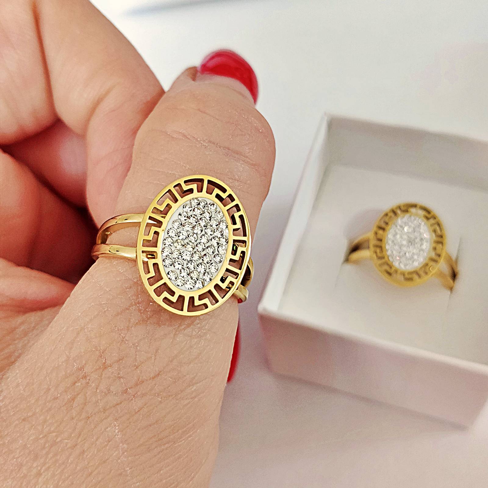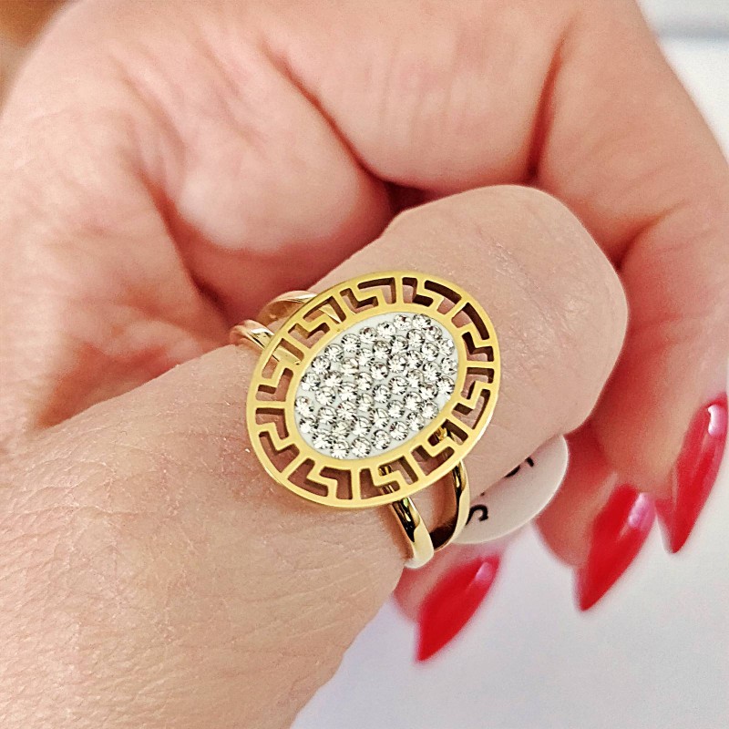 Luksus w klasycznym wydaniu. Ten zjawiskowy, złoty pierścionek ze stali chirurgicznej przyciąga spojrzenia swoją bogatą formą. Głównym elementem ozdobnym jest duża, owalna tarcza (ok. 16 mm), której środek gęsto wysadzano błyszczącymi cyrkoniami. Całość otacza starannie wycięty, ażurowy wzór grecki (meander), który dodaje biżuterii ponadczasowej elegancji i antycznego charakteru. To idealny wybór dla kobiet ceniących wyraziste, "bogate" dodatki, które stanowią główny akcent stylizacji.